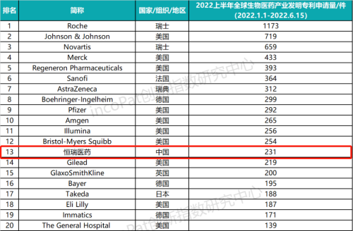 专利是药企最有价值的资产之一,是企业发展的基石,对做原创创新的企业尤为重要。全球专利数据库incoPat创新指数研究中心对2022年1月1日至2022年6月15日公开的全球生物医药产业发明专利申请数量进行统计排名,生物医药产业专利涉及生物技术药、基因工程药物、疫苗、诊断试剂、微生态制剂、血液制品等技术领域。入榜企业/医院主要来自13个国家、组织或地区,罗氏、强生、诺华分别位列前三,bifa·必发医药(231件)排名第13位,领跑中国药企。