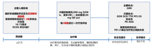 本研究为多中心、开放、单臂的Ⅱ期临床试验,旨在评价卡瑞利珠单抗联合苹果酸法米替尼治疗晚期泌尿系统肿瘤和妇科肿瘤患者的有效性和安全性。队列5入组复发转移阶段经过1-2线系统治疗失败的宫颈鳞状细胞癌患者,接受卡瑞利珠单抗(200mg 每3周一次)联合苹果酸法米替尼(20mg 每日一次)治疗。主要研究终点为基于RECIST 1.1标准评估的客观缓解率(ORR)。