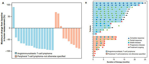 截至2024年12月20日,中位随访时间15.2个月,22例(32.8%)患者达到完全缓解,21例(31.3%)达到部分缓解,IRC评估的ORR为64.2%(95% CI,51.5-75.5)。在所有亚型中均观察到获益(ORR:AITL,70.3%[26/37];PTCL-NOS,57.1%[8/14];ENKTL-NT,50.0%[2/4];ALCL,ALK-,42.9%[3/7];ALCL,ALK+,50.0%[1/2];MEITL,100%[1/1];其他,100%[2/2])。在出现缓解的患者中,51.2%(22/43)的患者目前仍在缓解中,估计的中位DoR为18.7个月(95% CI,6.3-未达到[NR])。中位PFS为10.0个月(95% CI,3.7-15.7),中位OS尚未达到。安全性整体可控。