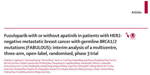 1. Huiping Li, et al. Fuzuloparib with or without apatinib in HER2- metastatic breast cancer (mBC) patients (pts) with germline BRCA1/2 mutations (gBRCA1/2m): A randomized phase III trial. Volume 26,lssue 12,P1563-1574,December 2025.